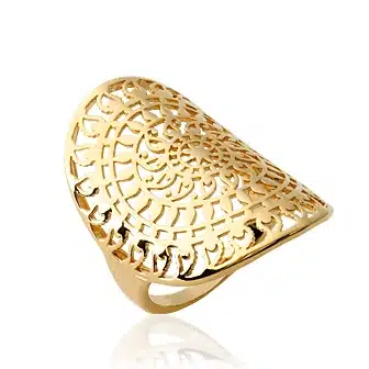 Bague longue couvrant le doigt en plaqué or, composée d’une large plaque ajourée aux motifs arabesques. Sa surface travaillée forme un dessin rayonnant qui habille visuellement la main. Ce modèle associe plaqué or 18 carats, structure étendue et motif décoratif pour un rendu affirmé, pensé pour celles qui recherchent une bague en plaqué or de qualité au style marqué.