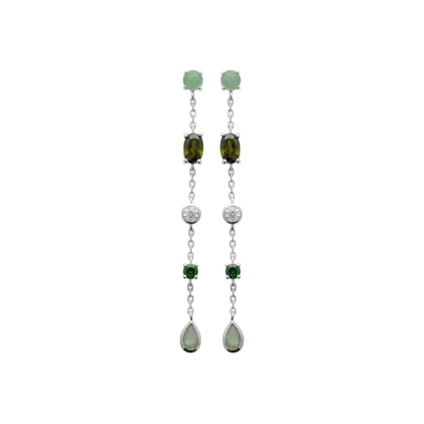 Enveloppé dans l’éclat de l’argent rhodié, ce bijou évoque la magie des moments précieux. Les boucles d’oreilles pendantes captent le regard grâce à la danse des aventurines aux teintes douces, rappelant la sérénité d’un paysage forestier. Plus bas, l’émeraude, d’un vert profond, évoque le mystère et le luxe, tandis que les diamants synthétiques insufflent une brillance inégalée. Chaque gemme a été choisie pour sa beauté, formant une symphonie de couleurs et d’éclats.