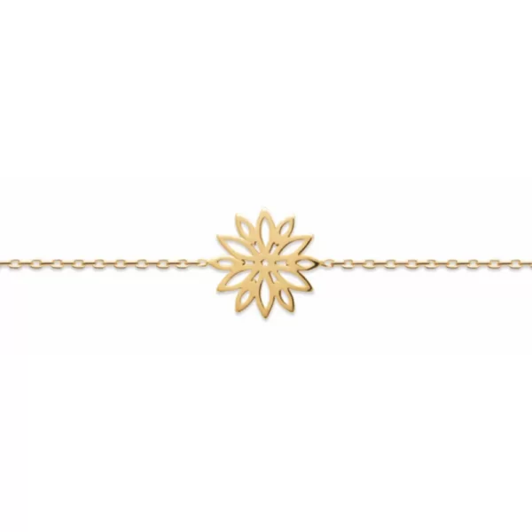 Le Bracelet plaqué or fleur ajourée est une ode à la beauté naturelle et à l’élégance intemporelle. Sa pièce centrale, une fleur ajourée façon origami, évoque subtilement une Edelweiss ou une Aster, des symboles de pureté et de force dans le langage des fleurs. La couleur jaune de ce bijou, d’une luminosité exceptionnelle, est le fruit d’un plaqué or de 3 microns d’épaisseur, garantissant une présence scintillante au poignet de la femme qui le porte.