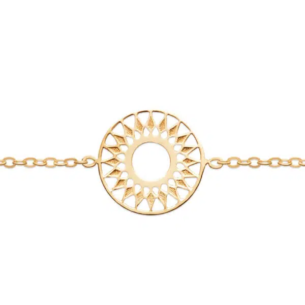 Un souffle de lumière vient enlacer votre poignet avec ce bijou aux courbes solaires. Ce jonc large, orné d’un motif central évoquant un astre rayonnant, diffuse une aura chaleureuse et protectrice, rappelant la splendeur des journées d’été les plus douces.