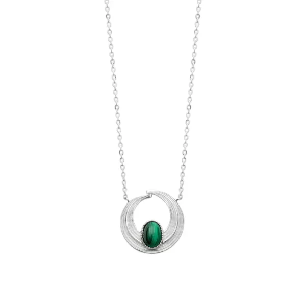 La malachite, protagoniste de ce collier, est mise en valeur par son cadre organique. Sa teinte verte, traversée de bandes plus foncées, évoque les forêts denses et les prairies luxuriantes. Son éclat velouté, accentué par la lumière, attire l’œil et souligne la singularité de chaque pièce, car chaque pierre possède un motif unique.