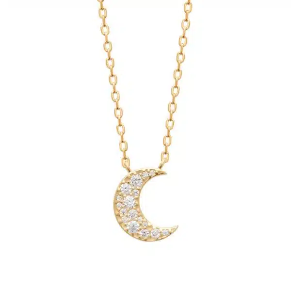 Un croissant délicat, serti de petits zircons brillants, semble flotter au-dessus du décolleté, évoquant une nuit claire où la lune dessine son arc lumineux dans le ciel. Sa présence subtile invite à rêver et à se connecter à une poésie intérieure.